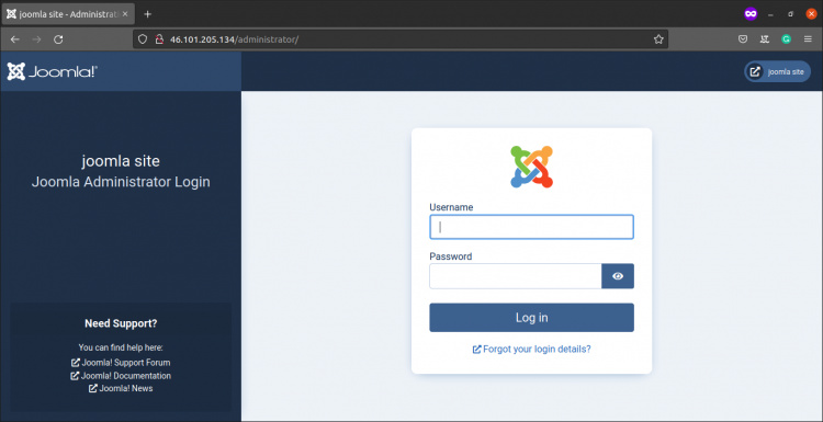 Desde, Aquí puedes tiempo http://your_ip_or_domain/administrator,Te llevará a la página de Administrador de Joomla como se muestra en la siguiente captura de pantalla.