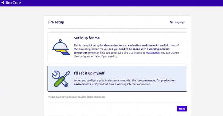 Ahora, abre tu navegador web y accede a la interfaz web de Jira utilizando la URL http://your-server-ip:8080. Se te redirigirá a la siguiente pantalla: