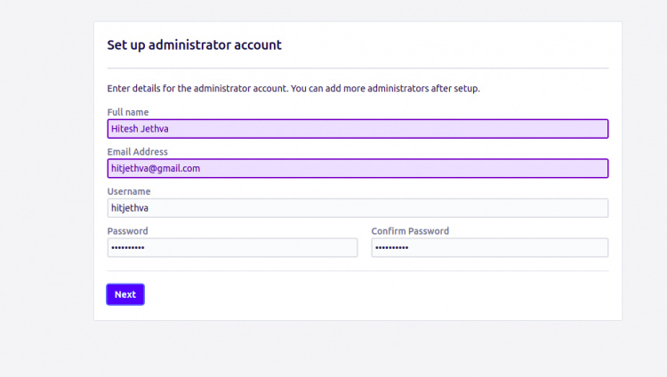Proporciona los datos de tu cuenta de administrador y pulsa el botón Siguiente. Deberías ver la siguiente pantalla: