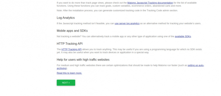 Haz clic en el botón SIGUIENTE. Deberías ver la pantalla de comprobación de requisitos previos de Matomo: