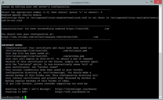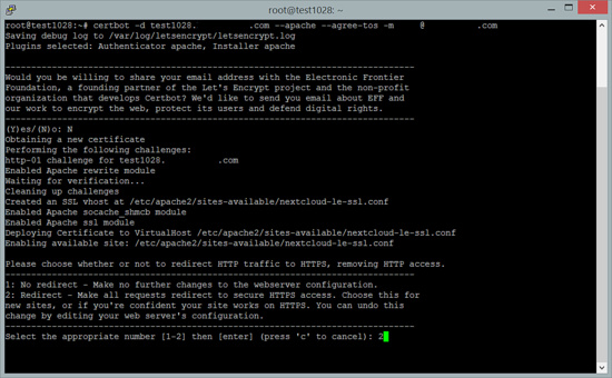Si el servidor Nextcloud debe ser accesible sólo por HTTPS (lo que se recomienda por razones de seguridad), entonces elige aquí ‘2’. Si quieres poder acceder a Nextcloud con HTTP y HTTPS, elige ‘1’.
