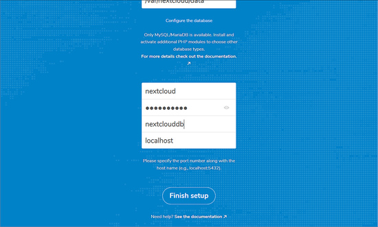 Introduce el nombre de usuario y la contraseña deseados para el usuario administrador de Nextcloud y establece la ruta de datos en ‘/var/nextcloud/data’.
