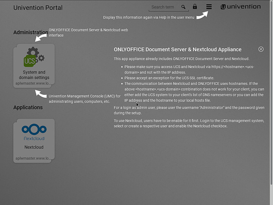Para saber más sobre las aplicaciones virtuales de Univention (y en caso de que seas usuario de ownCloud y quieras obtener ONLYOFFICE en combinación con ownCloud), consulta la guía anterior.