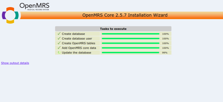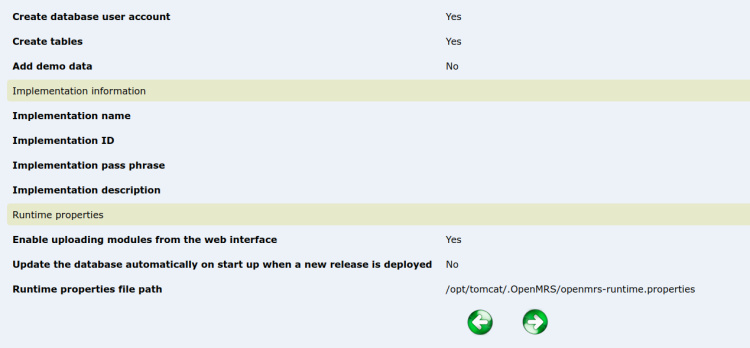 Pulsa el botón => para crear una base de datos para OpenMRS y completar la instalación.