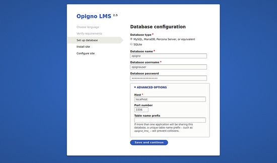 A continuación, introduce el nombre de tu base de datos, el nombre de usuario y la contraseña. A continuación, haz clic en el botón Guardar y continuar. Deberías ver la página siguiente: