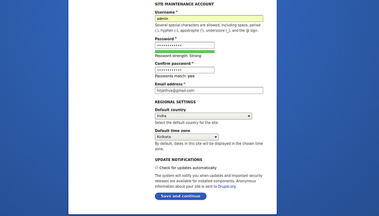A continuación, indica el nombre del sitio, el correo electrónico, el nombre de usuario y la contraseña del administrador. A continuación, haz clic en el botón Guardar y continuar. Deberías ver la siguiente página:
