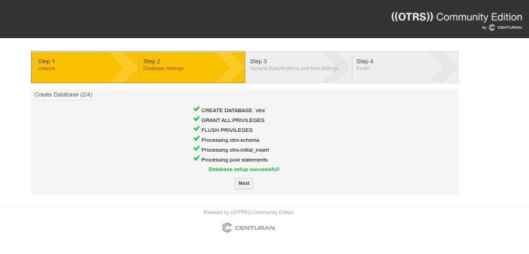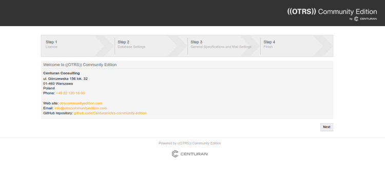 Llegados a este punto, OTRS está instalado y configurado. Ahora, abre tu navegador web y accede al asistente de instalación web de OTRS utilizando la URL http://your-server-ip/otrs/installer.pl. Deberías ver la página de bienvenida de OTRS en la siguiente pantalla: