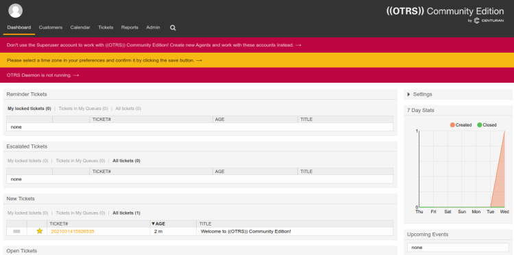 Puedes ver el error «OTRS Daemon not runnig error» en la pantalla anterior.