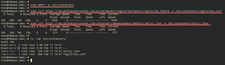 Después de instalar las dependencias de los paquetes Podman, necesitamos crear el directorio de contenedores ‘/etc/containers’ y descargar alguna configuración en él.