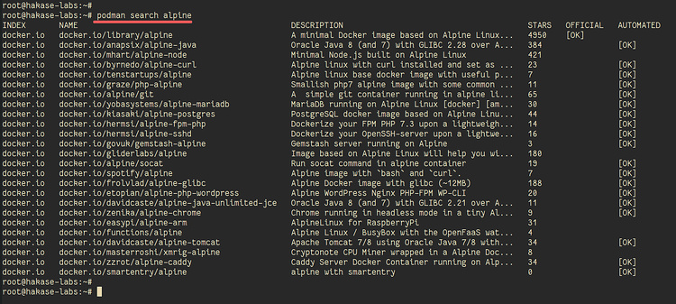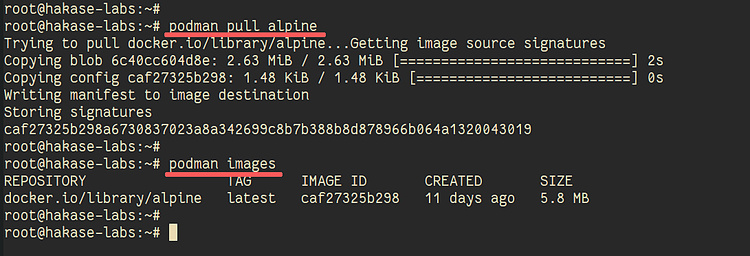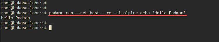 podman run --net host --rm -ti alpine echo 'Hello Podman'