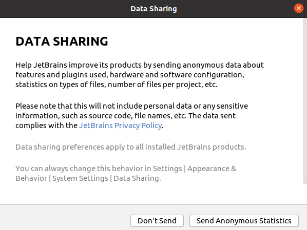 Aparecerá otra pantalla como la siguiente. Pulsa el botón «No enviar» para proceder al lanzamiento de PyCharm.