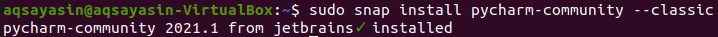 En primer lugar, veremos cómo instalar pyCharm mediante el comando terminal. Existen diferentes versiones de PyCharm disponibles para ser instaladas en sistemas Linux. Así que veremos cada una de ellas, una por una. Si eres un estudiante o un principiante y quieres instalar su versión comunitaria a través del terminal, entonces tienes que utilizar el comando Sudo de abajo junto con la utilidad «snap» mientras utilizas la palabra clave para la versión «comunitaria» de PyCharm. Se tarda poco tiempo en instalarlo.