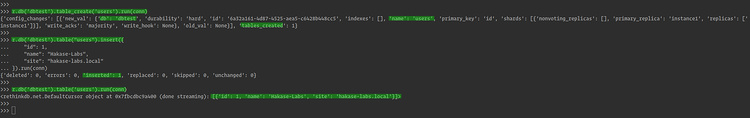 Como resultado, te has conectado con éxito al servidor RethinkDB, has creado una nueva base de datos y has insertado datos en ella utilizando el controlador de cliente Python.