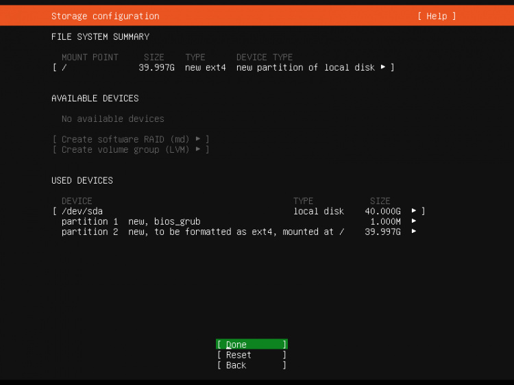 El instalador muestra a continuación la configuración de almacenamiento por defecto. Consiste en una partición bios_grub de 1MB más una partición / grande que contendrá la instalación del sistema operativo. Elige «Hecho» para pasar a la siguiente pantalla.