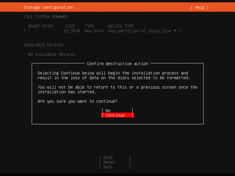 Antes de que comience la instalación, el instalador de Ubuntu te pide que confirmes la partición. Pulsa la tecla «Tab» hasta que la opción «Continuar» aparezca resaltada en rojo y, a continuación, pulsa «Volver» para continuar.