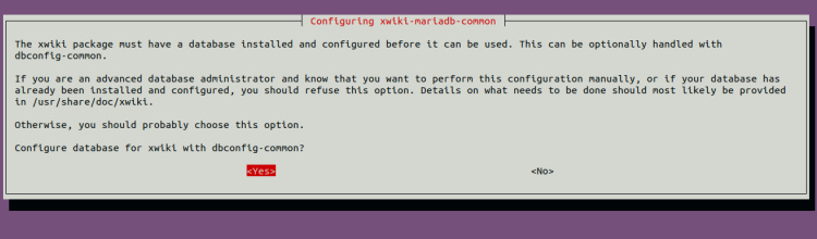 Selecciona Sí y pulsa la tecla Intro. Se te pedirá que establezcas una contraseña MySQL para XWiki: