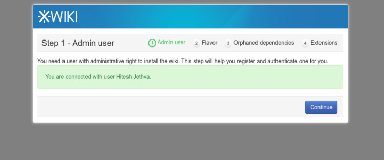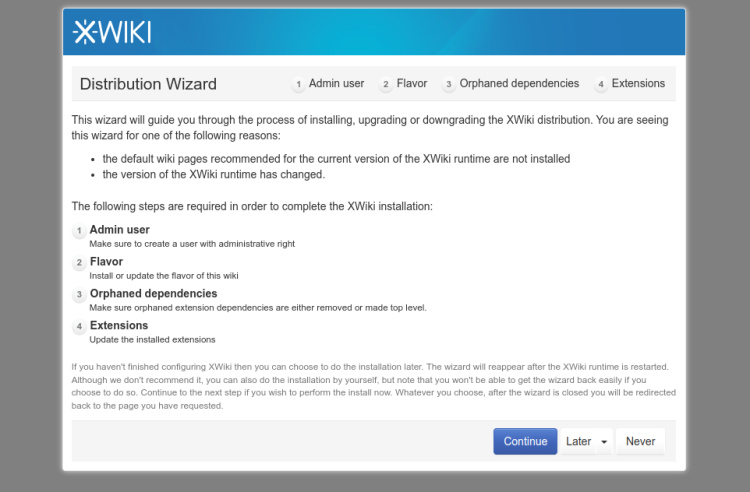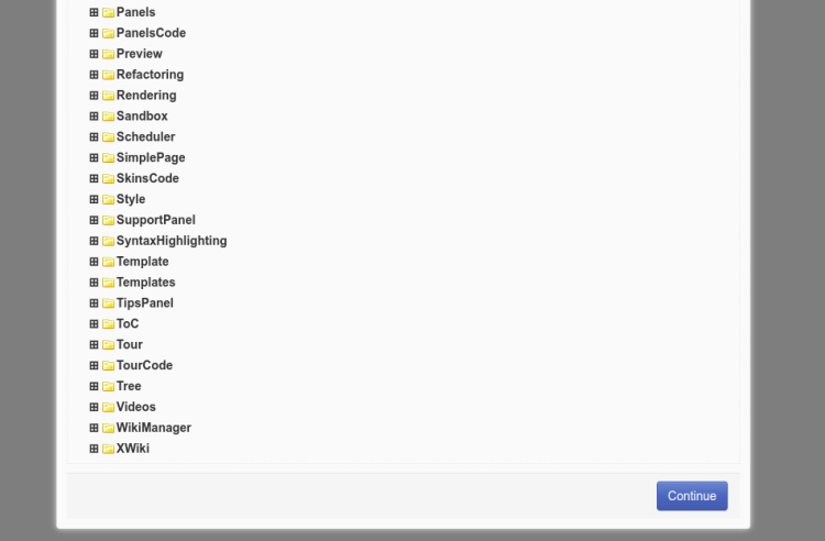 Pulsa el botón Continuar. Deberías ver el panel de control de XWiki en la siguiente pantalla: