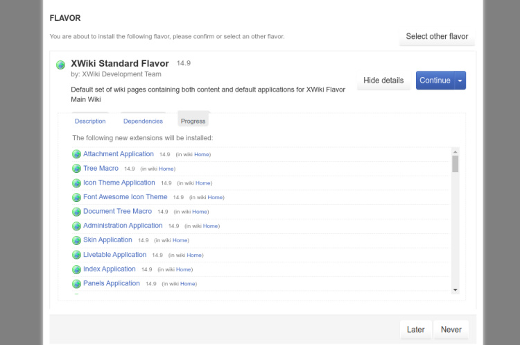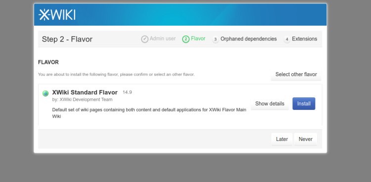 Selecciona tu tipo de XWiki y pulsa el botón Instalar este tipo. Deberías ver la siguiente pantalla: