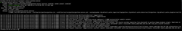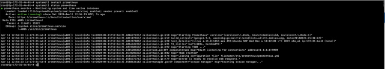 Para asegurarte de que elPrometheus se ha iniciado comprueba su estado. Consulta la siguiente captura de pantalla para ver el aspecto de la salida.