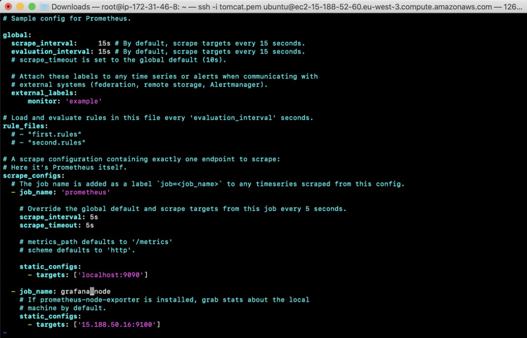 Para raspar las métricas en Prometheus exportadas por el Node_Exporter, necesitamos añadir la IP del Node_Exporter en el archivo de configuración de Prometheus. En la siguiente captura de pantalla puedes ver que la IP del Node_Exporter se ha añadido en «job_name:grafana_node». Realiza los mismos cambios en tu archivo de configuración