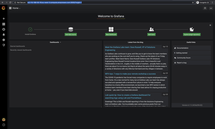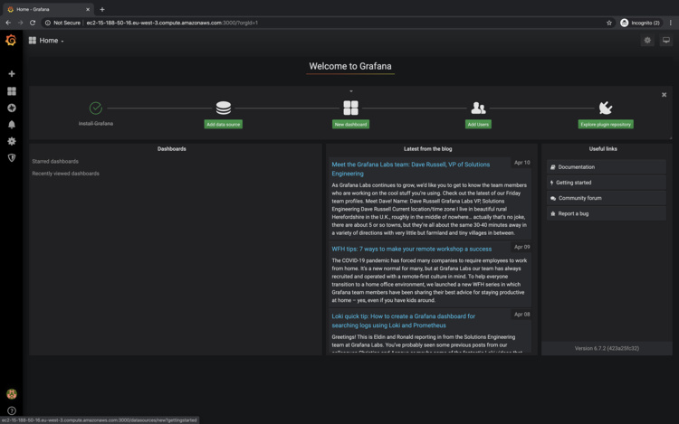 Podrás ver la siguiente pantalla una vez que cambies el nombre de usuario y la contraseña y te conectes con éxito a Grafana.