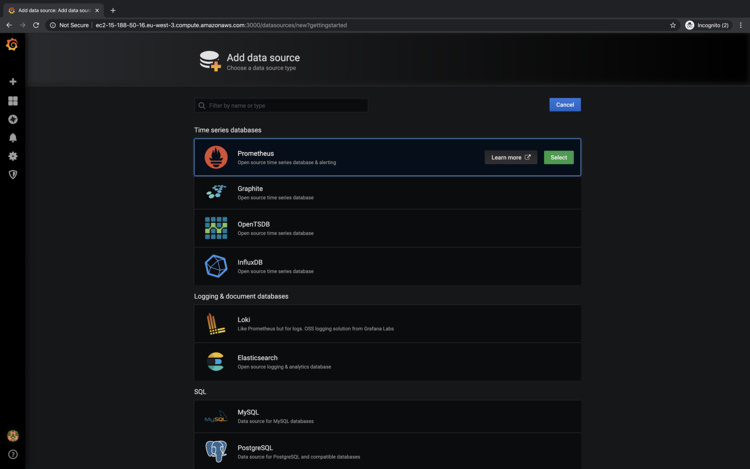 En la pantalla de bienvenida ahora puedes añadir Prometheus a Grafana en «Añadir fuente de datos». Haz clic en «Añadir fuente de datos».