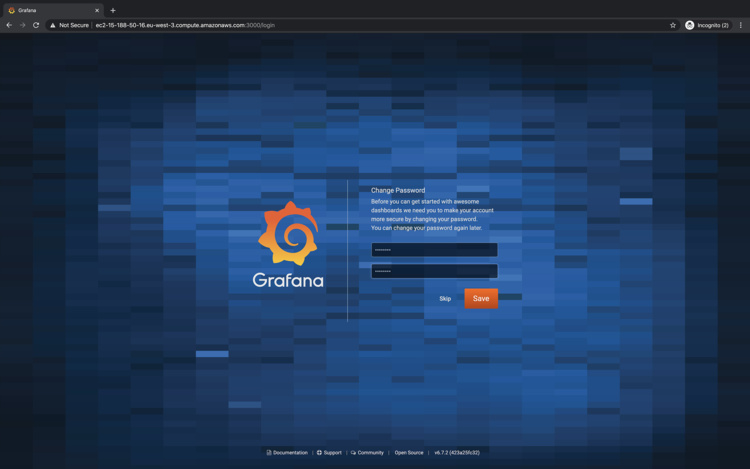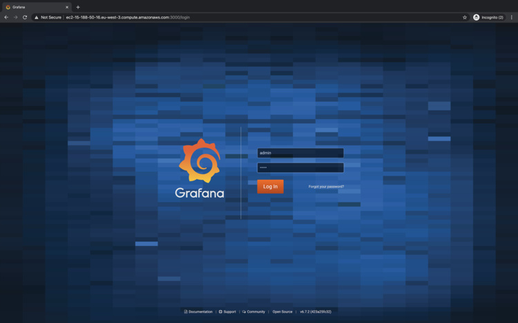 La primera vez que accedas a Grafana, introduce admin como nombre de usuario y contraseña.