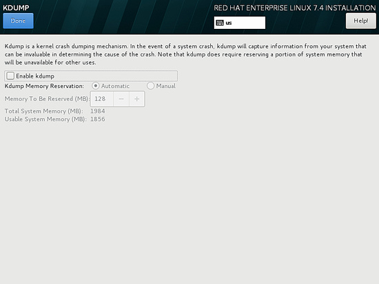 A continuación, pulsa el menú KDUMP y desactiva el mecanismo de bloqueo del núcleo KDUMP para liberar la RAM del sistema. Pulsa el botón Hecho para aplicar esta configuración y volver al menú principal.