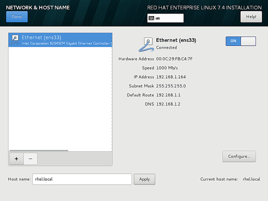 A continuación, pulsa el menú Red y nombre de host y configura el nombre de host FQDN de tu máquina. Pulsa el botón Aplicar para configurar el nombre de host de la máquina. También activa y habilita el servicio de red para tu interfaz ethernet cambiando el botón Ethernet de OFF a ON. Puedes configurar manualmente la interfaz de red en este paso, si es el caso, pulsando el botón Configurar. Cuando termines, pulsa el botón Hecho para volver al menú principal de instalación.