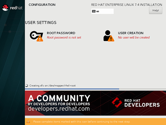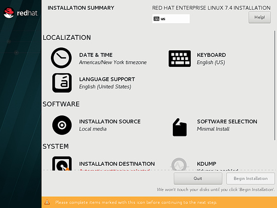 Por último, antes de iniciar el proceso de instalación, revisa todas las configuraciones del instalador. Cuando termines, pulsa el botón Comenzar instalación para empezar a instalar RHEL 7.