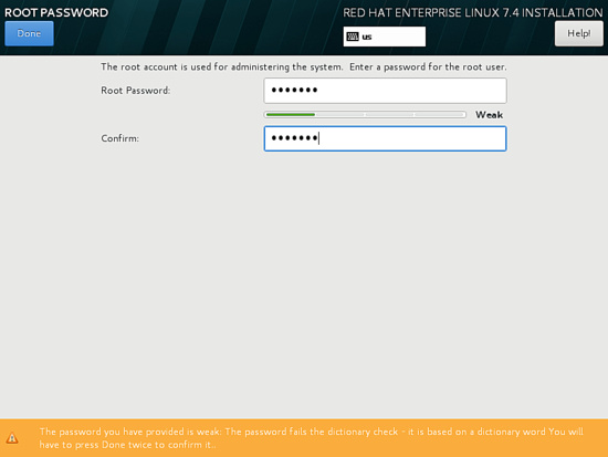 Una vez iniciado el instalador, aparecerá la pantalla de configuración de las cuentas de usuario. Pulsa en el menú CONTRASEÑA ROOT de la pantalla de configuración y configura una contraseña fuerte para la cuenta root. Cuando termines, pulsa el botón Hecho para volver a la pantalla de configuración de usuarios.