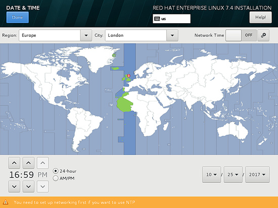 En la siguiente pantalla verás el menú de Resumen de la Instalación. Aquí, selecciona primero el menú Fecha y Hora para abrir este menú. Utiliza el mapa para seleccionar tu ubicación geográfica. Además, debajo del mapa tienes la opción de configurar la fecha y la hora. Si la hora está correctamente configurada, sólo tienes que pulsar el botón superior izquierdo de «Hecho» para completar esta etapa y volver al menú inicial, como se muestra en las siguientes imágenes.
