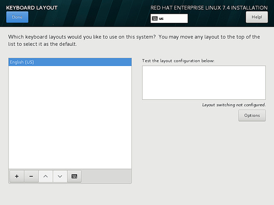 En el siguiente paso, pulsa en el menú Teclado y configura la distribución del teclado de tu sistema. Para añadir otra distribución de teclado pulsa el botón + y selecciona el teclado adecuado. Cuando termines este paso, pulsa en Hecho para volver al menú principal.