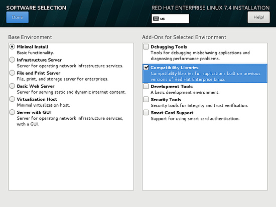 El entorno más adecuado para un servidor es la opción de Instalación Mínima, porque es la más flexible y ocupa poco espacio en el disco. Selecciona el entorno base de Instalación Mínima, selecciona los complementos de las Bibliotecas de Compatibilidad en el plano de la izquierda y pulsa el botón Hecho para finalizar esta configuración y volver al menú principal.