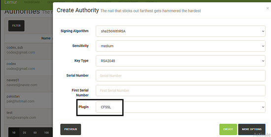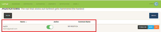 - Creación de la Autoridad usando CFSSL en la GUI de Lemur. Esta Autoridad CFSSL se utilizará en nuestros scripts para generar el certificado. He establecido el título «myCA» de la autoridad CFSSL en la GUI. Este título «myCA» se utilizará en la generación de certificados de Lemur.